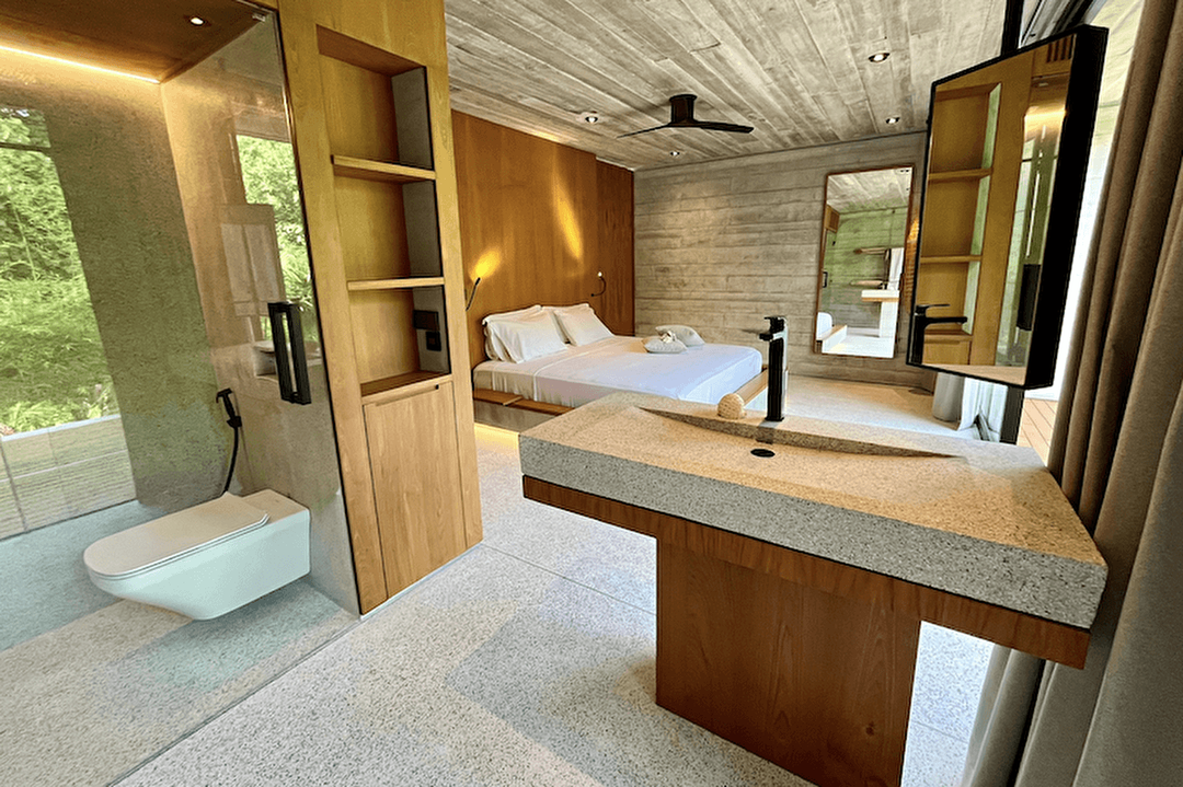 Spanning 100 sqm, this expansive villa is designed for those who seek deep relaxation and sustainable luxury. With floor-to-ceiling glass panels that blur the line between indoor comfort and outdoor wildness, this villa offers a seamless living experience surrounded by lush tropical greenery.