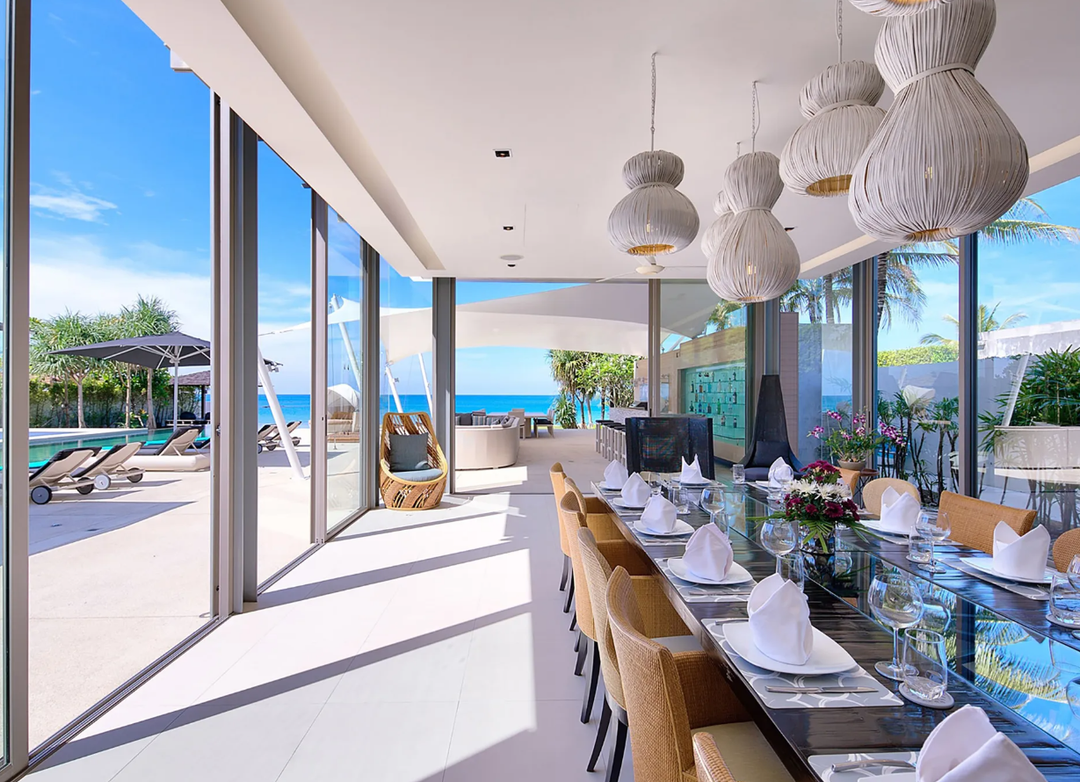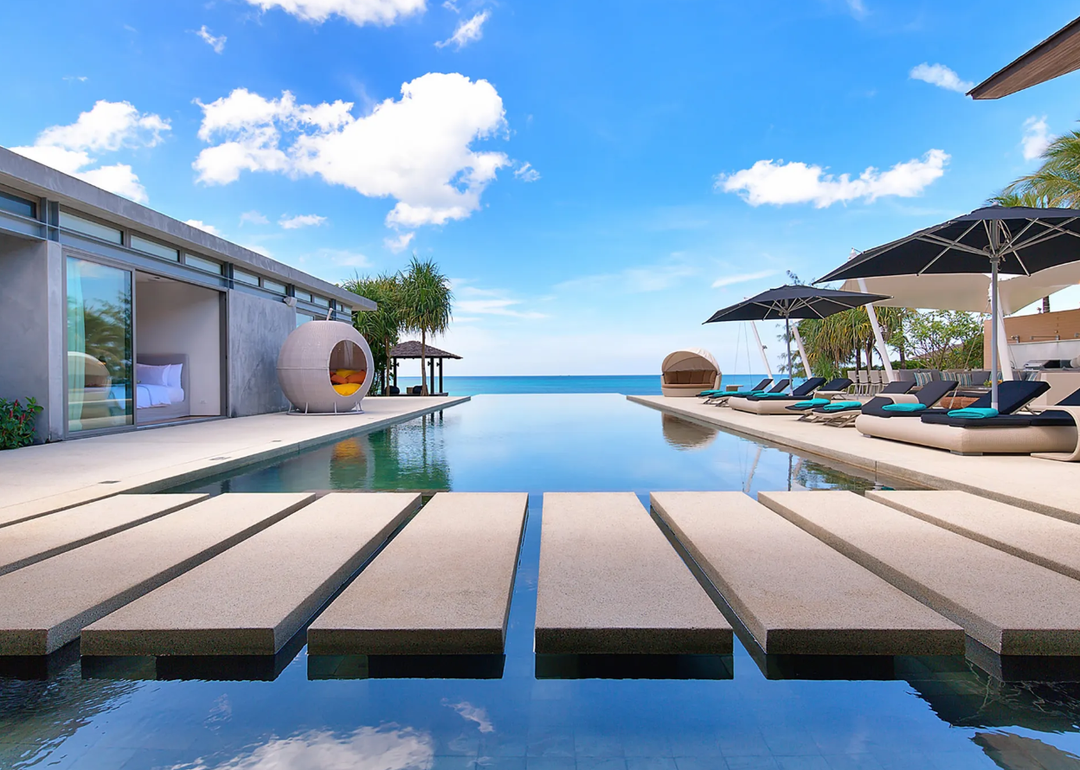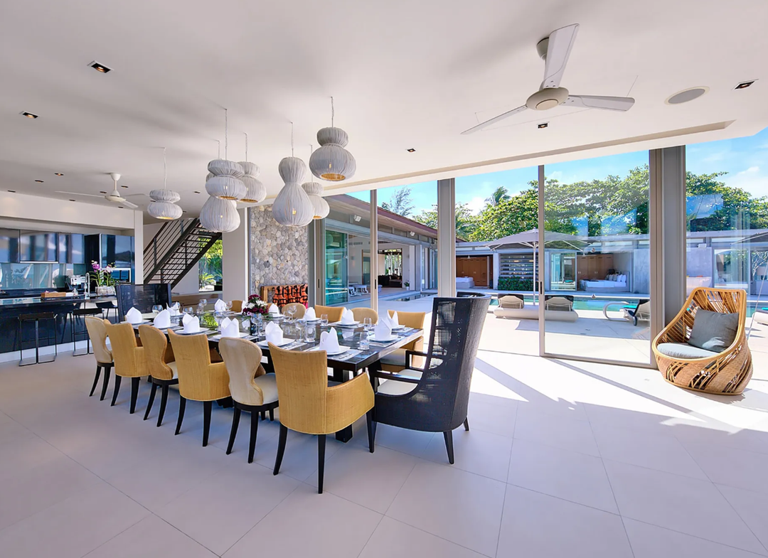 Nestled along the pristine shores of Natai Beach, The Vill embodies the essence of indoor-outdoor living, seamlessly blending its modern interiors with its verdant surroundings. Floor-to-ceiling windows bring in plenty of natural light, imbuing the timber-accented space with a bright and airy feel that befits its tropical setting.